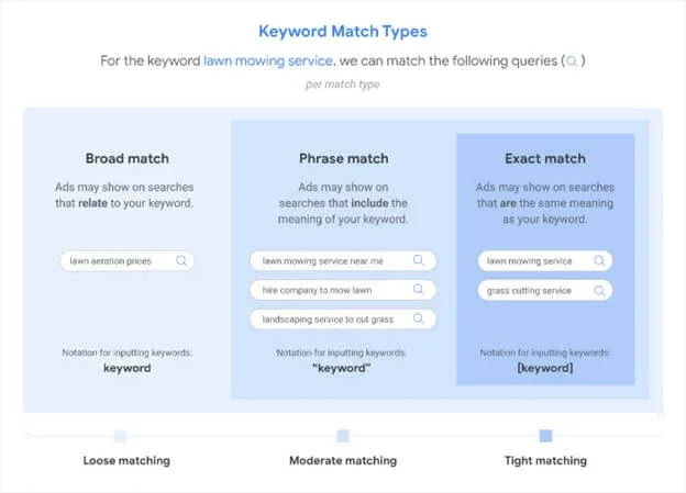 W poniższym przykładzie Google, słowo kluczowe [Usługa koszenia trawy] może być dopasowane do użytkowników szukających "usługi koszenia trawy". Aby dopasować się do słowa kluczowego exact match, nie muszą już występować dokładne słowa w wyszukiwaniu użytkownika. Jeśli ich znaczenie jest takie samo, Twoja reklama będzie mogła zostać wyświetlona. W przykładzie dopasowania frazy "usługa koszenia trawnika", pasującym wyszukiwaniem może być "wynajęcie firmy do koszenia trawnika". To wyszukiwanie zawiera znaczenie słowa kluczowego.